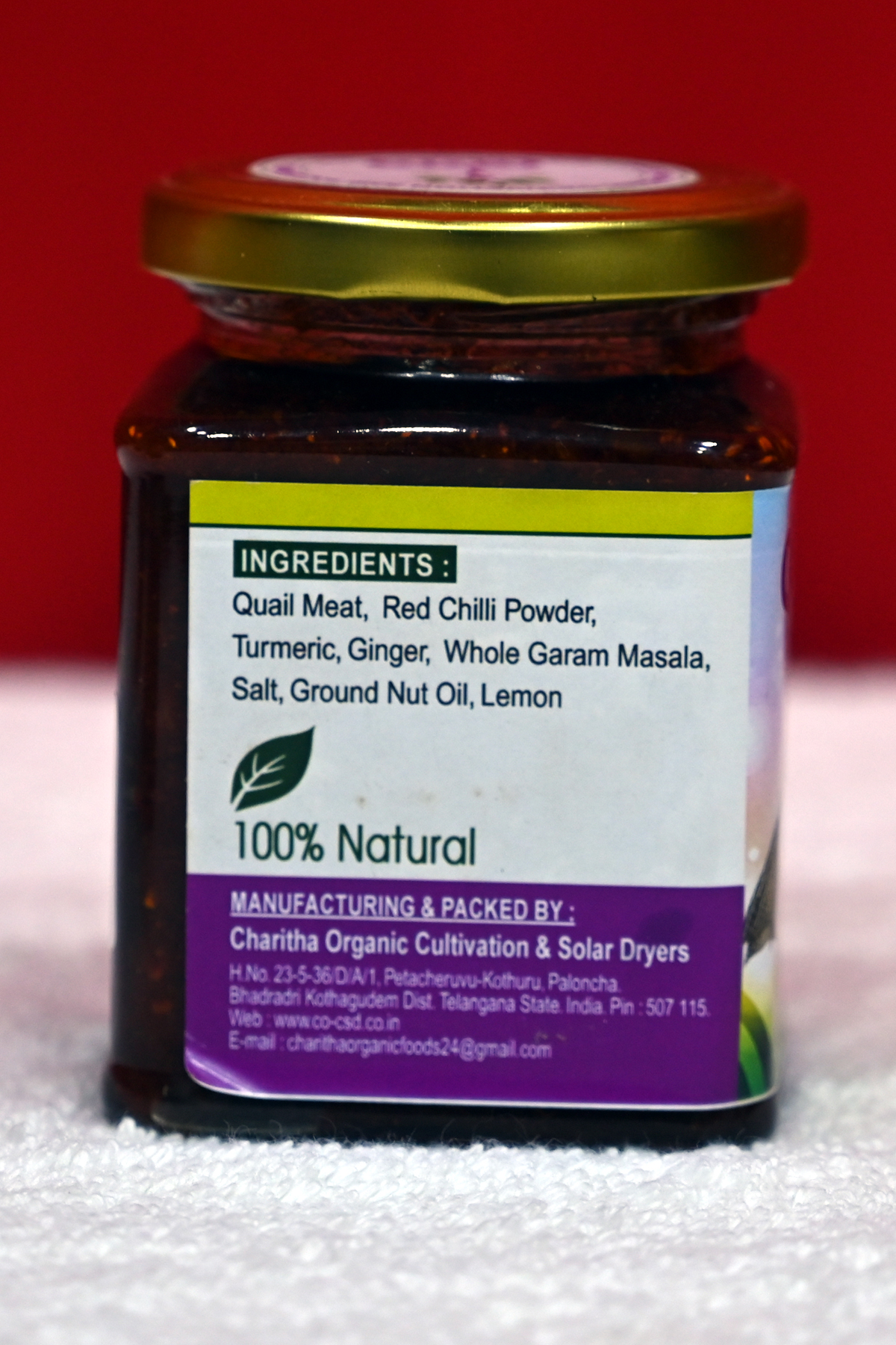- Ingredients: Dried Quail meat (65%), Dry chilli, Garlic, Ginger, Curry leaves, Chilli powder, Pepper powder, Turmeric powder, Fenugreek powder, Fennel seed powder, Garam masala, Salt, Mustard, Vinegar, Gingelly oil, Sunflower oil.